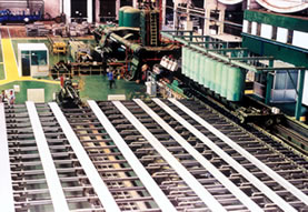 | 特種型材生產(chǎn)線主要包括9500t臥式擠壓機(jī);快速加熱鑄錠的圓、扁錠感應(yīng)加熱爐;Ф420、Ф500、Ф580mm圓擠壓筒;670×270mm扁擠壓筒及其活動(dòng)與固定擠壓墊片系統(tǒng);快速換模系統(tǒng);牽引機(jī)和同步熱據(jù)裝置;精密水、霧、氣在線淬火裝置;36m氣自動(dòng)冷床;360t可控拉矯機(jī);精密成品鋸床;輥矯機(jī);28m人工時(shí)效爐等設(shè)備??蓪?shí)現(xiàn)正向、反向(預(yù)留)擠壓、扁擠壓和穿孔擠壓以及活動(dòng)墊和固定墊擠壓功能,主要為地鐵列車、高速列車、雙層客車、輕軌列車以及大巴、船舶等現(xiàn)代交通工具,航天航空,電子電器,冷藏車和集裝箱、散熱器與空調(diào)器、液化天然氣罐和大型管母線等部門提供大型、扁寬、薄壁、精度高的復(fù)雜空心與實(shí)心型材及大徑薄壁精密管材。 |